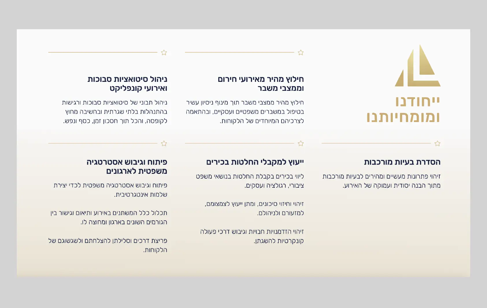 כחלק מהתמחות הסטודיו בעיצוב אתר מקצועי למגזר העסקי והמשפטי, שמנו דגש על חווית משתמש (UX) חכמה המאפשרת ניווט אינטואיטיבי בין תחומי העיסוק השונים של המשרד. התוצאה היא נוכחות דיגיטלית עוצמתית שמחזקת את המותג "ליאור ושות'" כסמכות מובילה בתחומה ומייצרת בידול משמעותי בזירה הדיגיטלית.